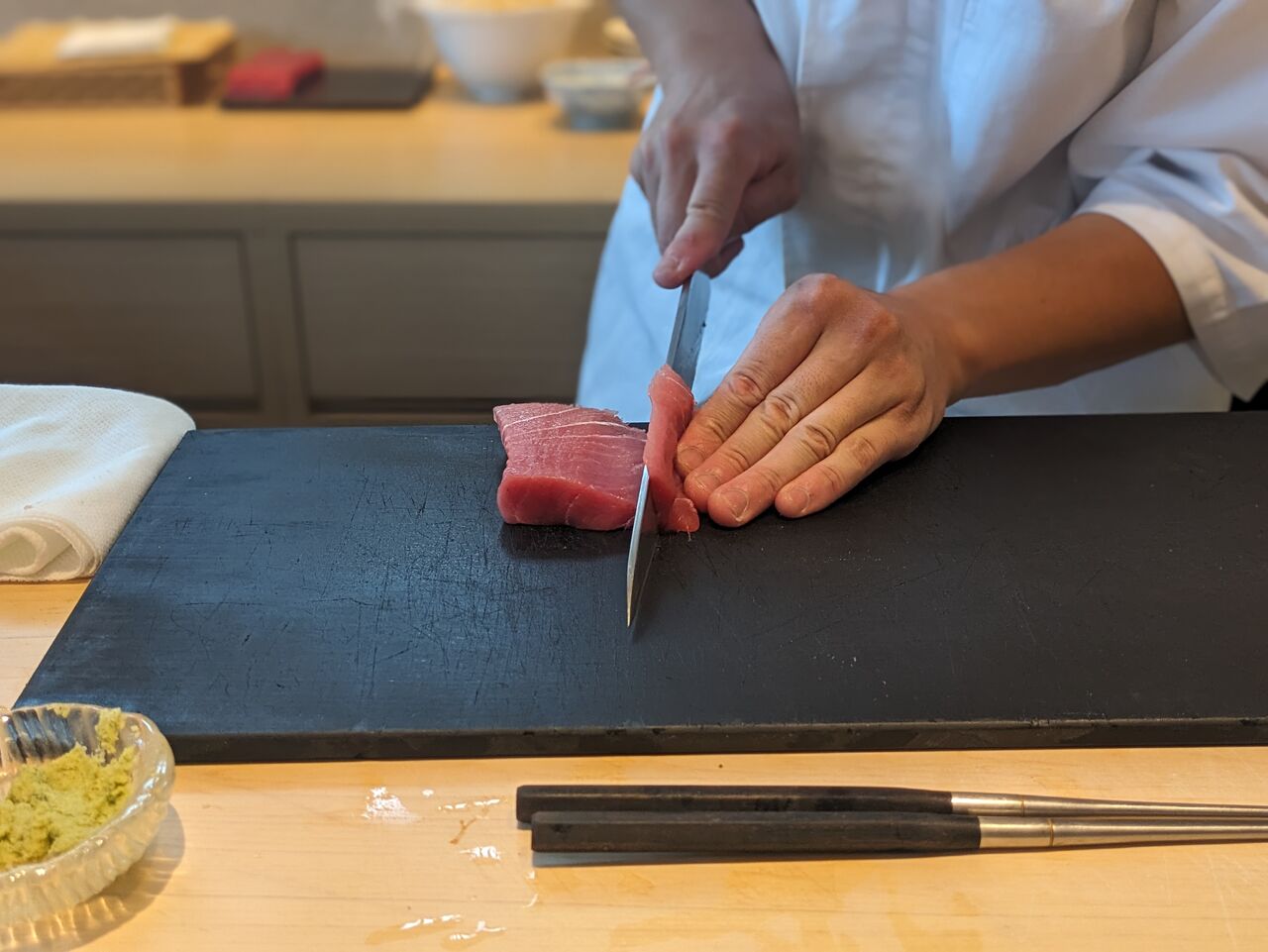 ん?山家さんがなにやらマグロの身を