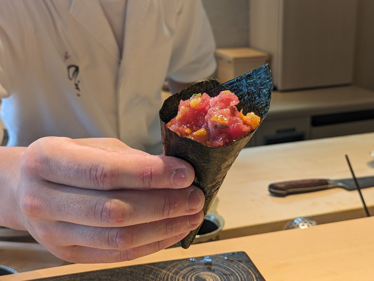 お鮨最後の一品は『トロタク手巻き』
